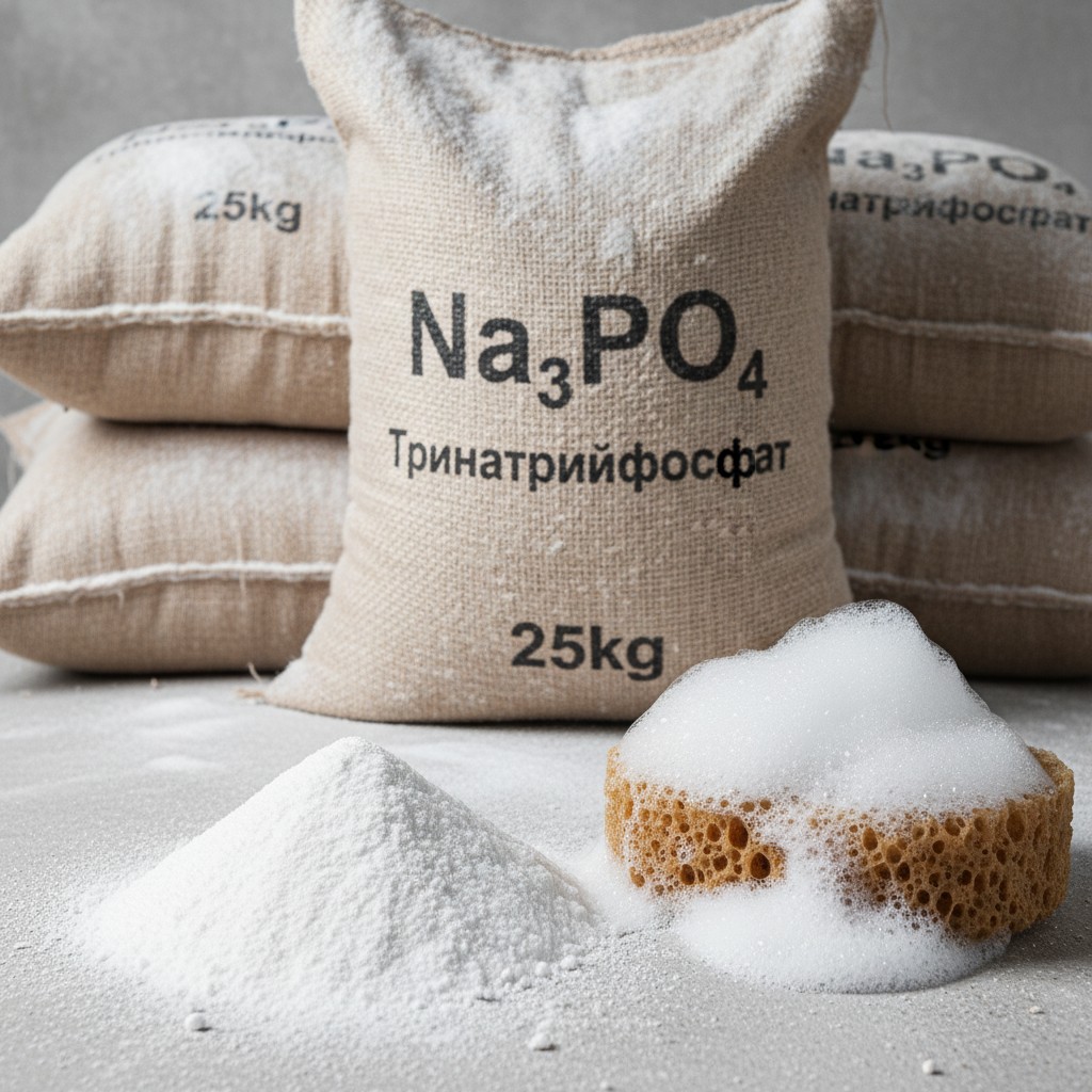 Тринатрийфосфат (TSP, Na₃PO₄) — неорганическая соль ортофосфорной кислоты. В быту и промышленности он известен как щёлочной агент для моющих средств, «усилитель» моющих составов и технический реагент для очистки и подготовки поверхностей. В пищевой отрасли родственные фосфаты натрия используются как добавки-регуляторы кислотности и стабилизаторы, но конкретная форма и статус применения зависят от регламентов и марки сырья (пищевой/технический).